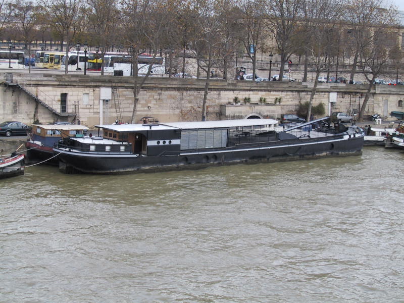 La Seine, une péniche ammarrée au port des Tuileries, depuis le quai Anatole France, en face de l'Assemblée Nationale à Paris